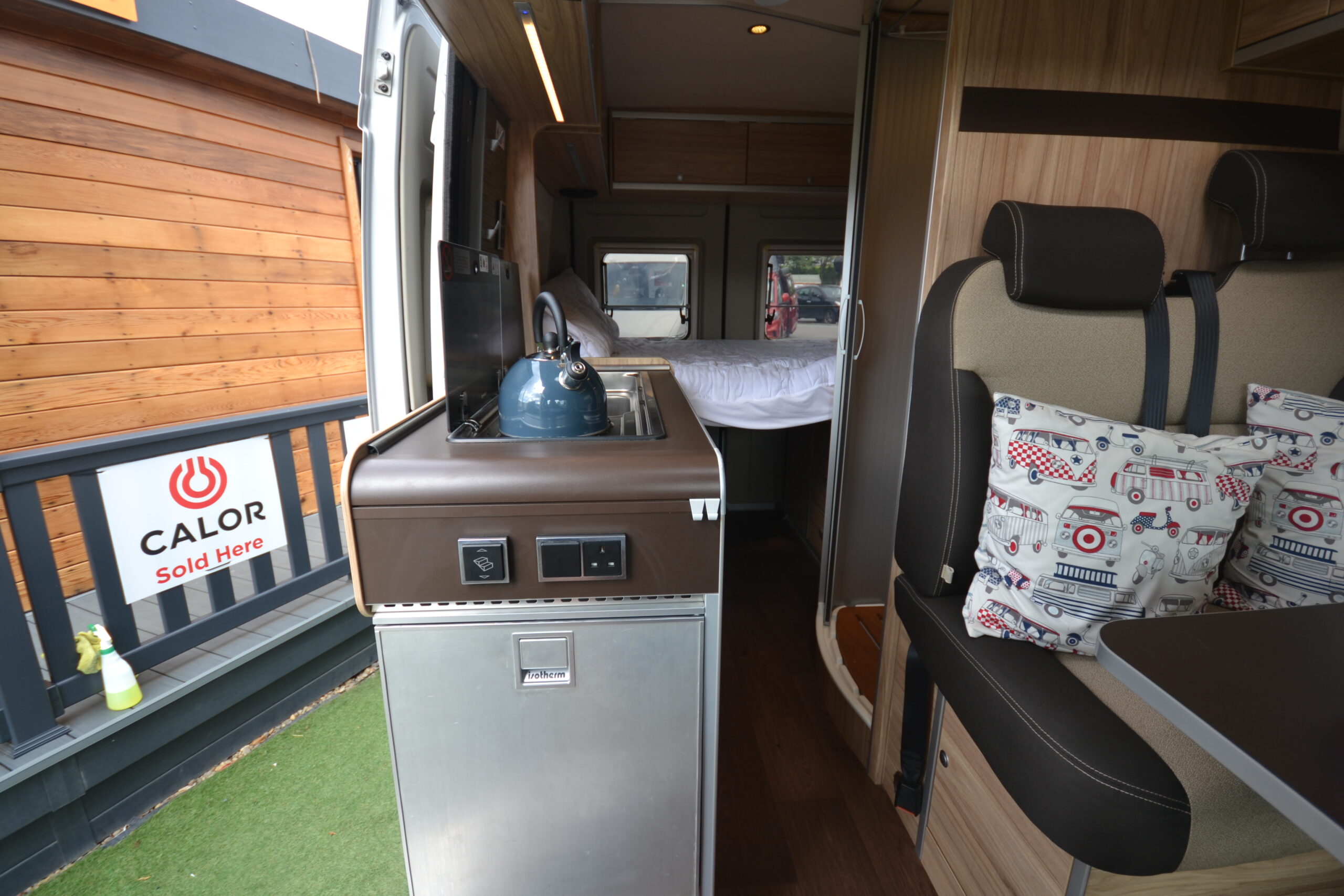 The open plan living area feels undeniably roomy and bright, the kitchen unit has a cooker/sink combination with a 2-burner gas hob and a removable work-top extension. With 4 person seating and a rear transverse bed, plus pop-top roof there is plenty of sleeping space with no compromise on comfort and the guarantee a good nights’ sleep for all. With the added bonus of an electric slide out step and Thule Omnistor Wind-out Awning to make your camping experience even better!