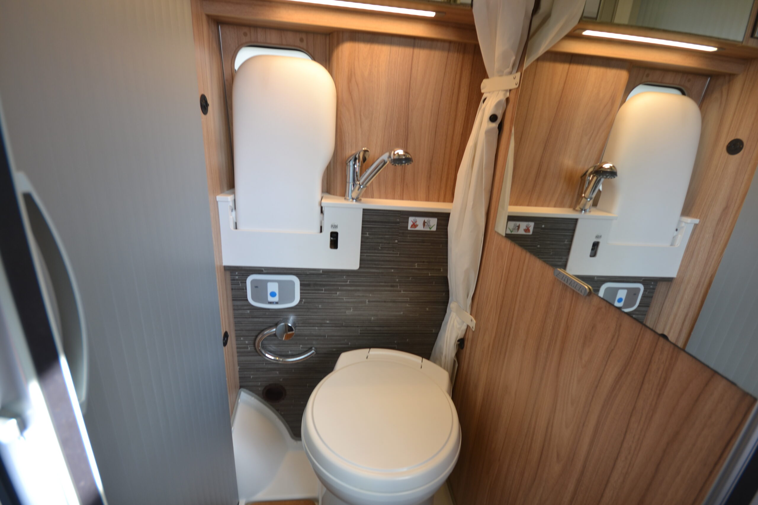 The compact bathroom is incredibly practical, with a shower, washbasin, toilet and mirror, all closed off by a space-saving tambour door.