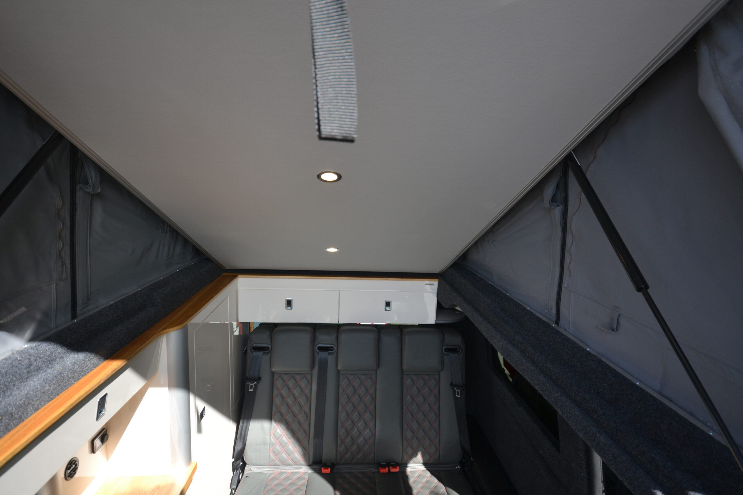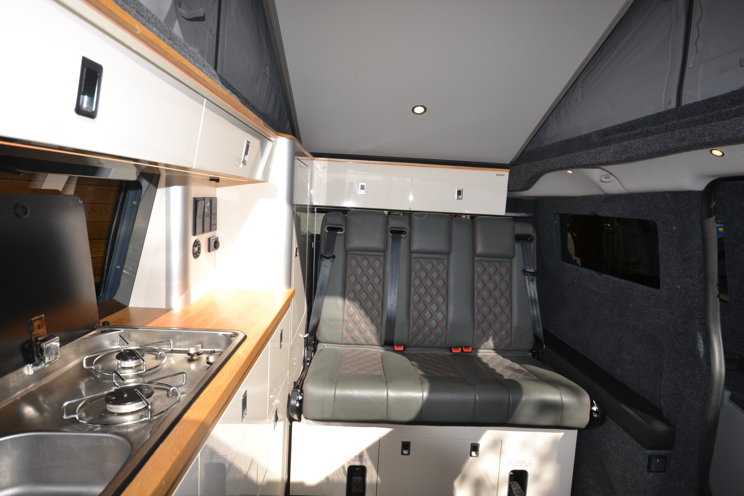 The highest quality Pop-Top Roof System with Integrated Roof Bed on Froli Springs. An underslung winterproof 40L Fresh Water Tank with Level Indicator and a 40L winterproof Wastewater Tank.