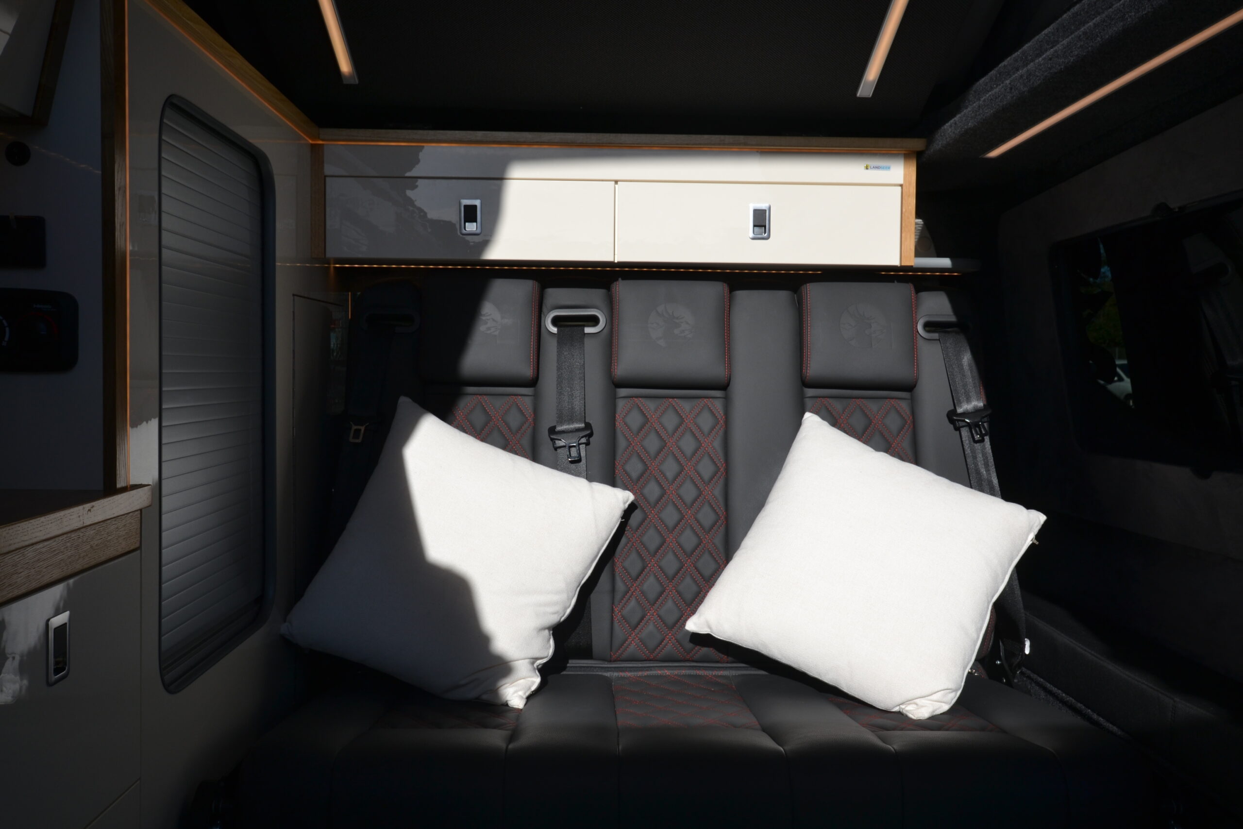 Boasting solid oak worktops original cream gloss, motion-detected interior cabinet lighting,  drop sink with solid oak lid that can double up as a chopping board, the familiar sliding seat system with unlimited locking positions so your passengers can be up close leaving you with a huge boot area.