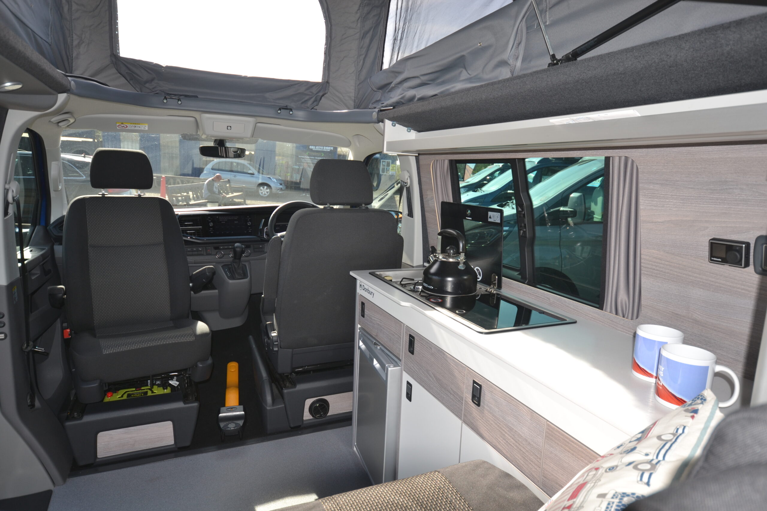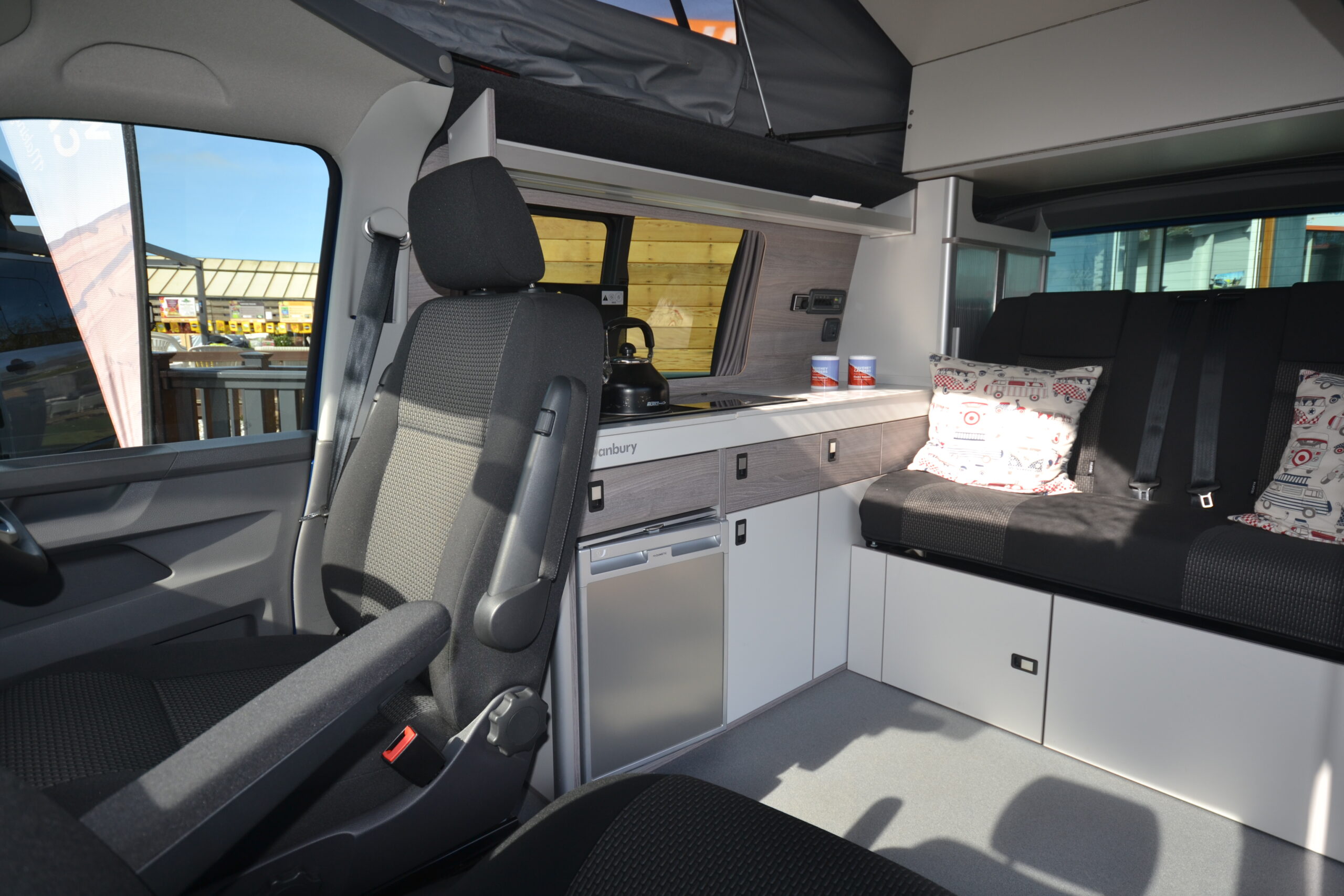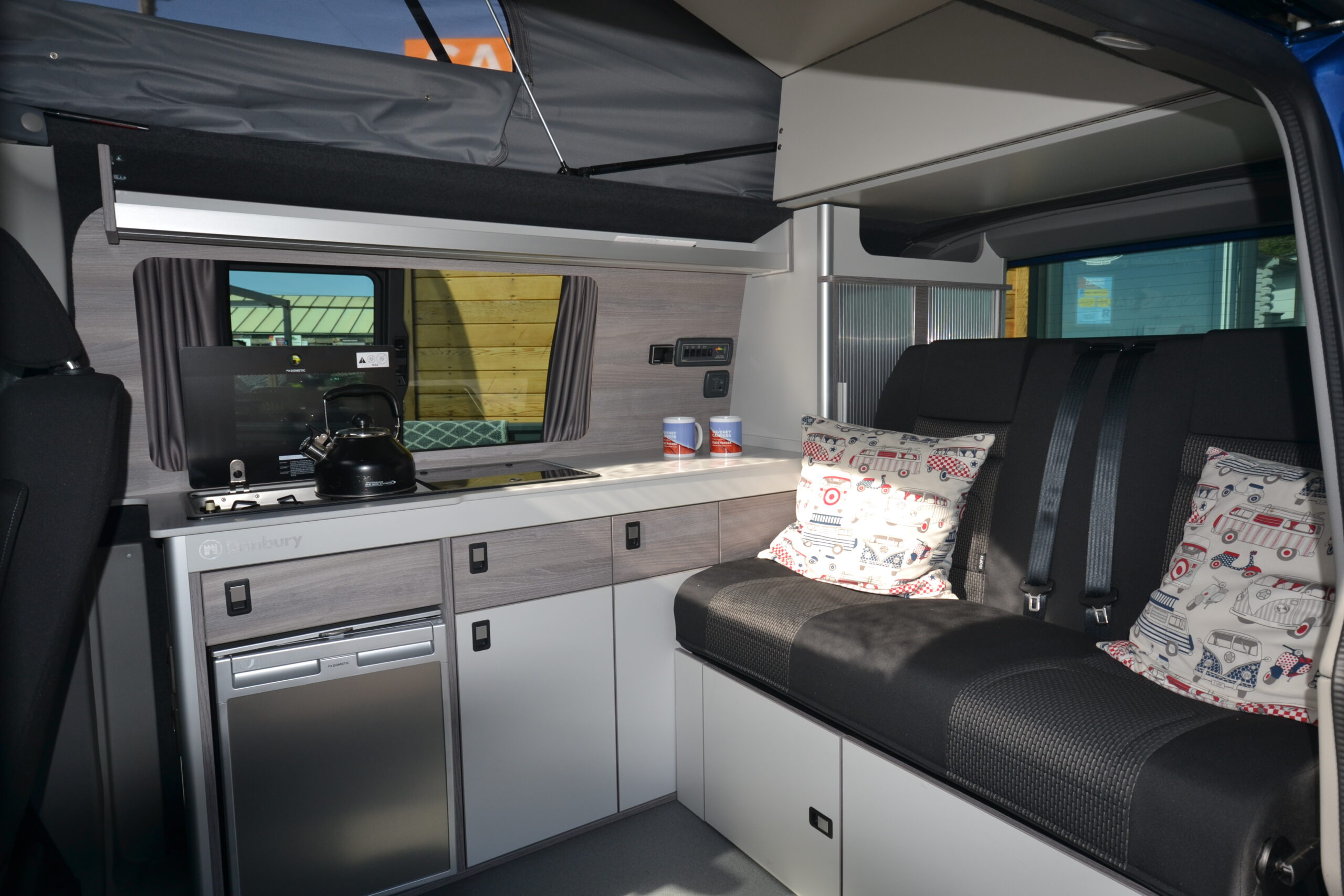 The conversion focuses on practicality and comfort featuring an integrated stainless-steel sink and a two-gas burner hob with plenty of additional countertop space. With storage all around and a pop-top roof featuring a roof-bed with a built-in mattress, you’ll never struggle for storage or space inside.